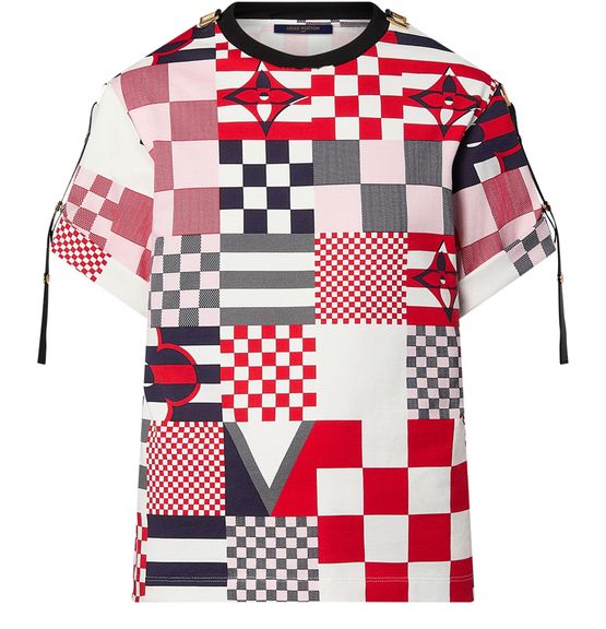 A patchwork print of Damier motifs, Monogram Flowers and the LV x America's Cup 2024 capsule's flag signature elevates this cotton jersey T-shirt into a graphic seasonal statement. The casually rolled short sleeves are embellished with studded leather tabs, while the House’s D-ring details add a modern touch to the contrasting crew neckline.