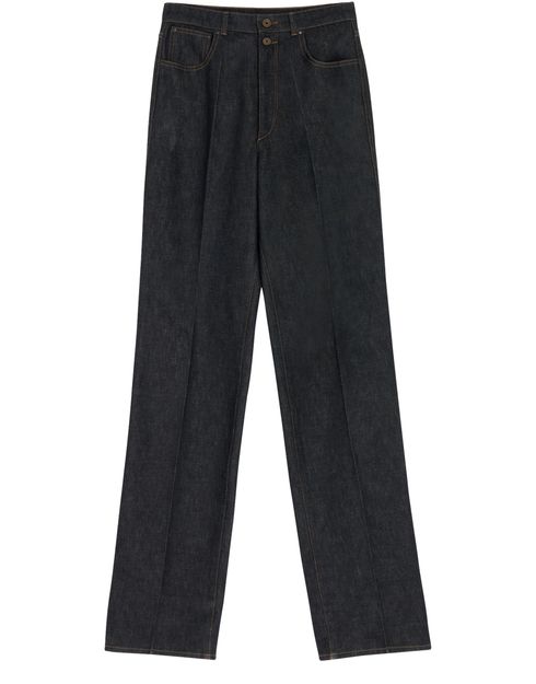 Introducing Lemaire's high waisted straight jeans, a masterpiece of casual style. Crafted from faded denim, these jeans feature front pleating, contrast stitching, and topstitched edges. The buttoned zipper closure and belt loops offer comfort and versatility for any occasion with two front pockets and a back patch pocket.