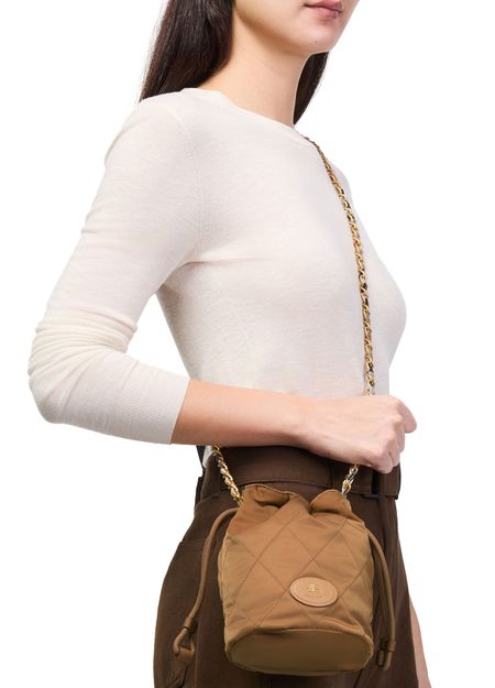 • Description : Small bucket bag, shoulder bag, knight design equestrian emblem, chain strap, front logo, chevron pattern, drawstring closure, visible topstitching, gold finish, padded texture.