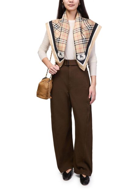 Reveal Burberry's small bucket bag, a statement piece defined by its chevron pattern and gold finish. The chain strap and drawstring closure add modern flair, while the Knight Design equestrian emblem and front logo showcase signature craftsmanship. Visible topstitching and padded texture complete this refined silhouette.