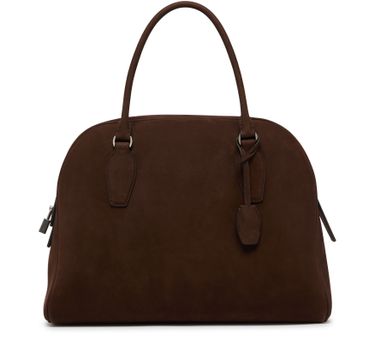 The Row's India 12.00 handbag showcases a refined silhouette with a secure zipper closure. Crafted with a leather handle and double handles, it offers versatile carrying options. Visible topstitching adds a touch of elegance, while the thin strap allows for hand carrying, making it the perfect companion for any occasion.