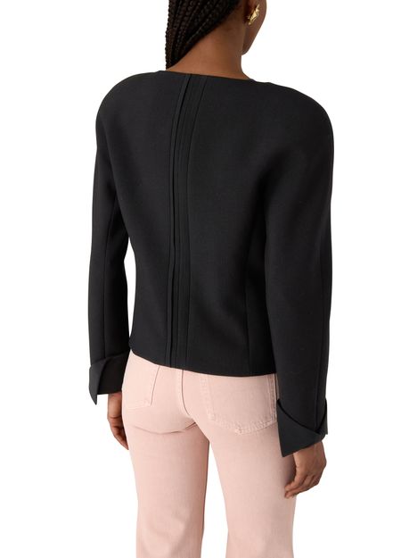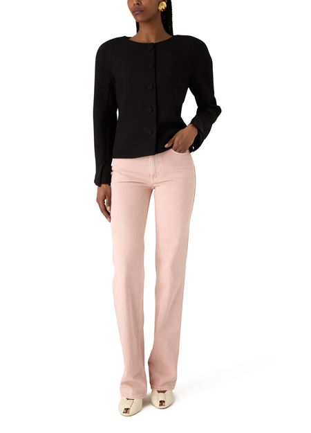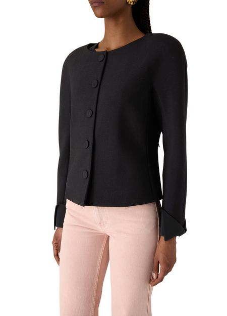 Reveal Chloe's Fitted collarless wool crepe jacket, crafted in a short silhouette with long sleeves and a collarless neckline. The button fastening, covered in the same fabric, adds a refined touch. This versatile piece transitions seamlessly from day to night, making it a standout addition to any modern wardrobe.
