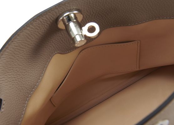 • Description : Medium bag, adjustable, detachable strap, two leather handles, grained leather, silver closure, large interior compartment, worn in the hand, on the shoulder or crossbody.
