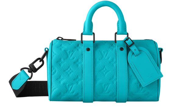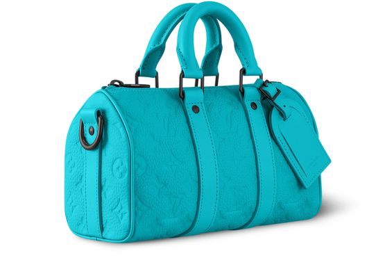 The Keepall Bandoulière 25 is made from turquoise Taurillon leather and features a removable signed textile strap. The strap is black and matches the bag’s rivets, zipper, and other hardware. Inside the crafted interior, there’s a flat pocket to keep cards or papers. The removable name tag, and the lateral bands, sign this as a Keepall.