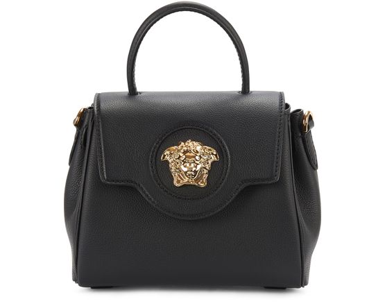 Enhanced by its multiple handles and chain shoulder strap, this Versace calfskin leather bag is uniquely charming and features subtle finishes.