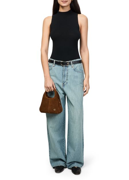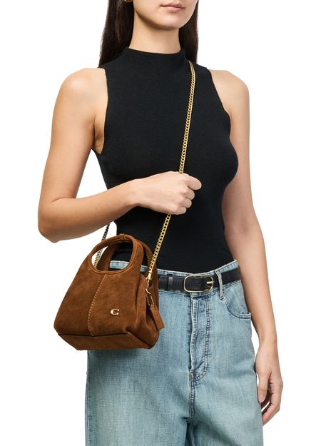 Reveal Coach's Lana 19 suede shoulder bag, crafted in sumptuous suede with double handles for versatile wear. Gold-finish hardware and a decorative 'C' detail elevate its modern silhouette, while the front metallic logo and visible stitching showcase Coach's signature craftsmanship and refined attention to detail.