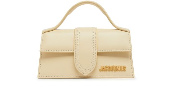 The Jacquemus Le Bambino bag is crafted from smooth leather and features a flap closure with visible topstitching. It comes with a thin strap that can be worn in the hand or on the shoulder. The bag is adorned with the brand's logo in gold letters, adding a touch of elegance to the design.