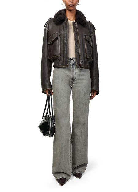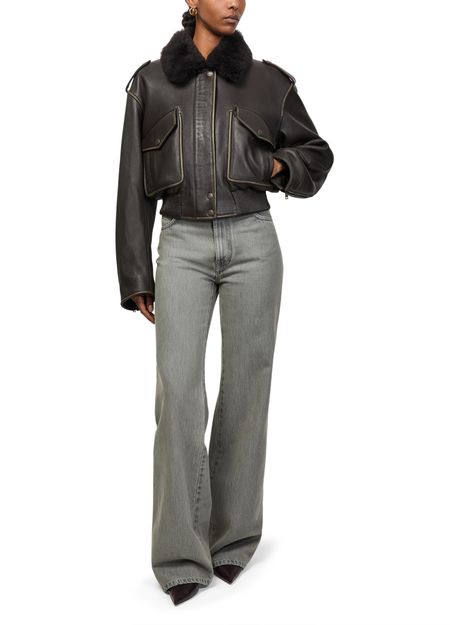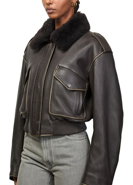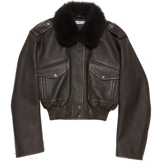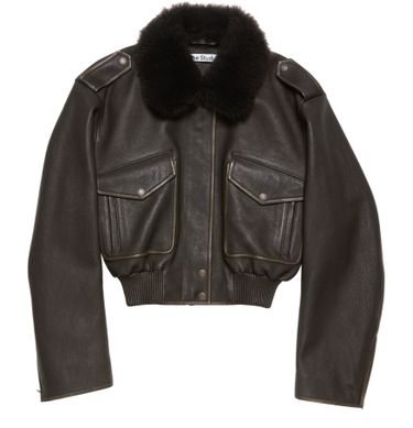 Reveal Acne Studios's leather bomber jacket, crafted from smooth leather for a refined finish. The cropped silhouette and long sleeves create a modern edge, while the zipper closure and flap pockets add practical flair. Fur detailing elevates its appeal, making it a versatile choice for any occasion.
