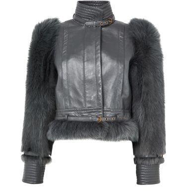 Reveal Chloe's leather jacket, a short silhouette with a high neck and long sleeves. The concealed closure and fur detail add a refined touch, while supple leather ensures a modern edge. Perfect for elevating any look, this piece transitions seamlessly from day to evening.