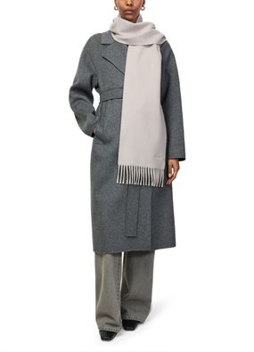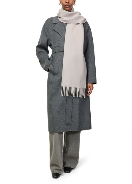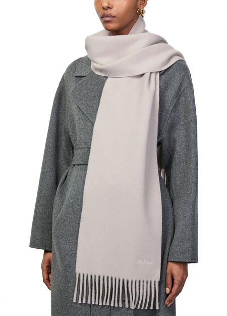 Reveal Max Mara logo scarf, featuring expertly embroidered logo and refined fringed edges. This accessory brings a sophisticated touch to any ensemble, blending timeless design with modern flair. The delicate fringe details add subtle movement, making it a standout piece for contemporary wardrobes.