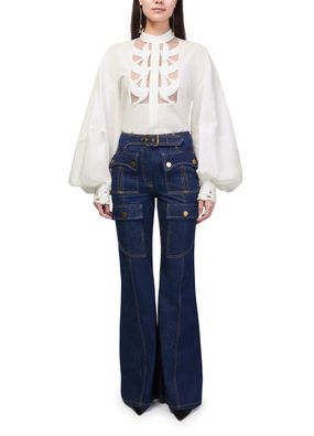 Reveal Zimmermann's Luna Utility flared jeans, crafted with ankle-length precision and defined by topstitched edges and patch details. The front and back paneling, along with flap and patch pockets, offer both style and function. Visible contrast stitching completes this modern silhouette for versatile, elevated dressing.
