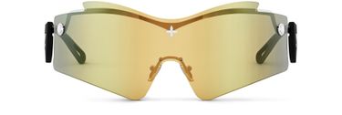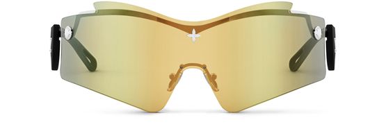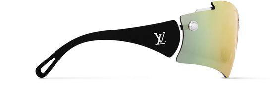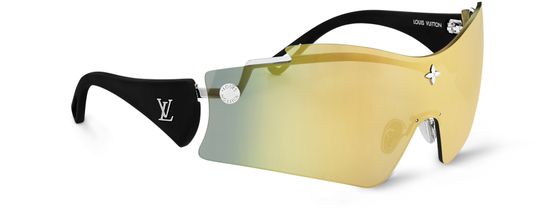 The sporty style of the LV Mirror Mask sunglasses lent an avant-garde aura to Nicolas Ghesquière’s Spring-Summer 2025 Cruise show. The sculptural shape of their mirrored lens is combined with ultra-comfortable rubber-finish temples accented by LV and Monogram Flower signatures in gold-toned metal. Trunk-style studs and a Monogram Flower on the lens add a final House flourish.
