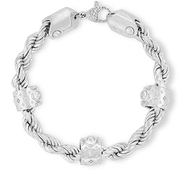 A masculine accessory enriched with historic House codes, the LV Rope Bracelet is forged from solid metal with an aged silver-color finish. The braided chain is accented with rings inspired by the hardware on classic Louis Vuitton trunks. Rings and rivets are all engraved with LV Initials as well as with the House's trademark. A mousqueton clasp secures the piece.