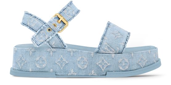 The Maya flatform sandal is a relaxed style in faded Monogram denim, which also covers its chunky platform. Fringed finishing on the straps and an engraved, gold-tone buckle add a refined, feminine feel. Lightweight and comfortable to wear, this model is finished with a rubber outsole.