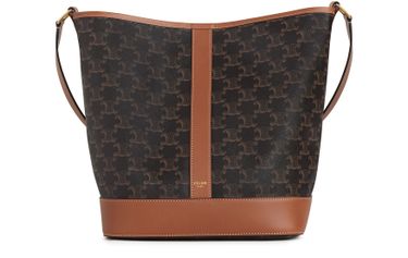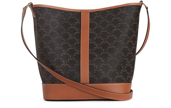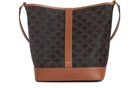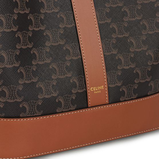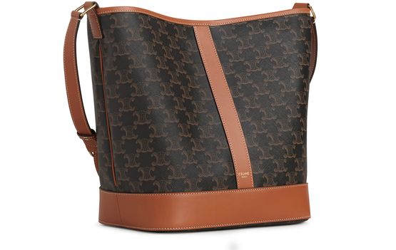 Celine's Medium bucket bag in Triomphe canvas is a stylish companion for any occasion. With a soft textile lining, it effortlessly transitions from crossbody to shoulder bag. The snap button closure secures your essentials, while the adjustable leather strap ensures comfort. Embrace sophistication with this versatile piece that elevates your look.