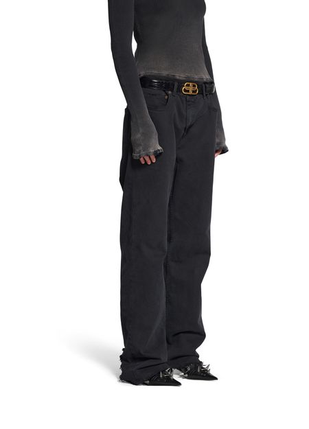 Soft black left hand denim unisex Balenciaga Pantalon Fit Medium. Features medium fit, mid-waist, covered zip fly, 5 belt loops, 5 pockets, destroyed back hem, Balenciaga engraved flex buttons, inlaid patch at back. Made in Italy. Dry cleaning recommended.