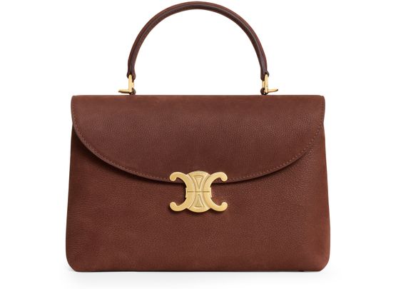 Reveal Celine's Medium Nino bag in grained nubuck, perfect for versatile carrying. With gold finishing, it features a Triomphe metallic closure, two compartments, and multiple interior pockets, including a zipped one. A removable and adjustable strap complements its leather handle for hand, shoulder, or cross-body wear.