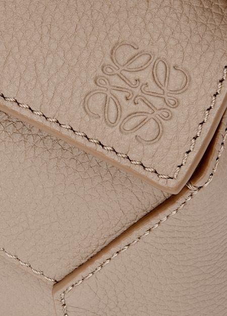 Reveal Loewe's Mini Puzzle Edge bag in soft grained calfskin, a statement piece defined by its supple texture and refined silhouette. The adjustable, detachable thin strap and single handle offer versatile styling, while the gold finish and front embossed logo add a signature touch of sophistication.