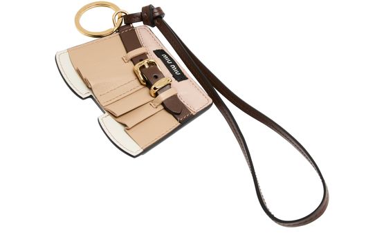 Miu Miu's skirt key chain showcases a playful design with a gold finish that catches the eye. Adorned with an appliquéd logo, this charming accessory adds a touch of whimsy to any bag. Perfect for those who appreciate fashion's finer details, it effortlessly combines elegance with a hint of fun.