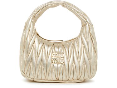 Miu Miu's Miu Wander hobo bag is crafted from chevron quilted leather with a metallic logo on the front. It features a gold logo in gold letters, a single handle for hand carrying or wearing crossbody, a zipper closure, and a padded texture with a gold finish.