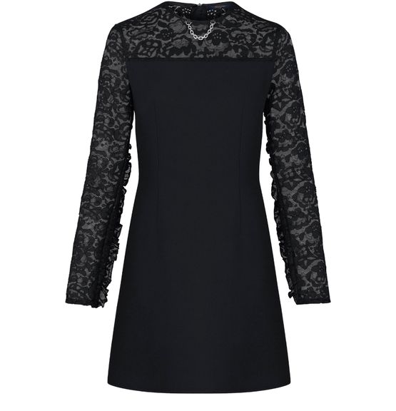 Monogram lace on the sleeves and below the neckline make this silk and wool dress ideal for the evening, as do the season’s ruffles running down the sleeves and continuing onto the back. A little palladium chain at the neck is a subtle signature.