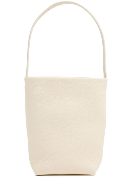 Introducing The Row's N/S Park Tote small bag, a masterpiece crafted from grained leather. This tote features a single handle and visible topstitching, highlighting its refined craftsmanship. The engraved logo adds a touch of elegance, while the single compartment ensures functional sophistication.