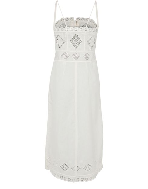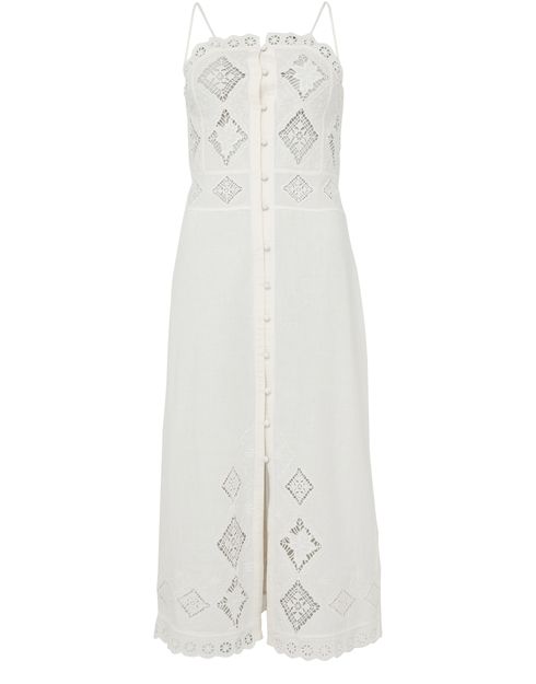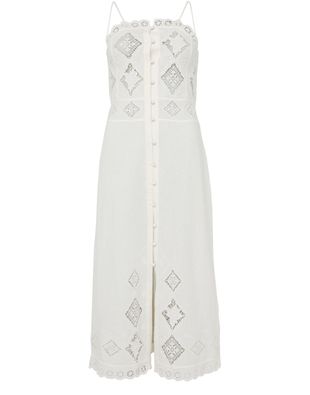 Reveal Isabel Marant's Nelsane dress, a sleeveless midi silhouette adorned with all-over embroidery. The front slit and delicate lace details add a refined touch, while button fastening and fabric-covered buttons ensure a seamless finish. Perfect for elevating your look from day to evening.
