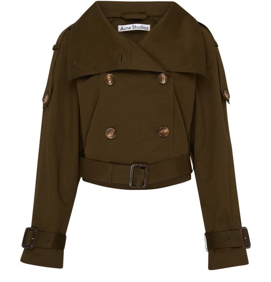 Acne's Oskana trench jacket is a modern take on a classic style. This cropped jacket features a buttoned fastening and a lapel collar for a sleek look. The belted waist and straight cut create a flattering silhouette. It's the perfect piece to add a chic touch to any outfit.