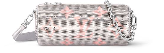 This precious edition of the Papillon pouch is covered in shimmering silver sequins on a satin base, with the Monogram pattern picked out in pink sequins. With its soft, cylindrical shape, this bag nestles snugly under the arm. It can also be carried in the hand thanks to its removable leather strap and removable, silver-tone chain.