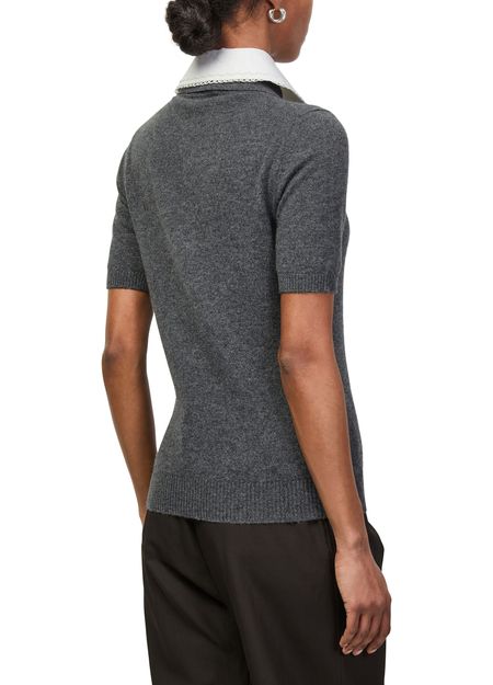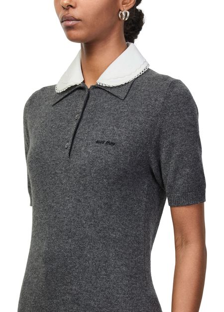Reveal Miu Miu's polo shirt with peter pan collar, featuring a delicately embroidered chest logo and short sleeves. The button fastening adds a refined touch, while the soft texture ensures comfort. Perfect for elevating both casual and sophisticated looks with a signature modern twist.