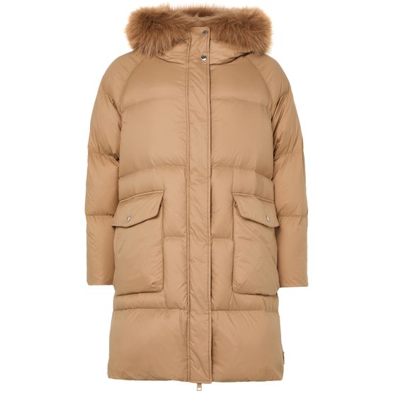 Introducing Yves Salomon's puffer jacket with a fox fur hood. This loose-fit parka features a concealed zipper and snap fastening, complemented by long sleeves and flap pockets. The padded texture and fur detail add a touch of elegance, making it perfect for versatile styling from casual to formal occasions.