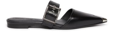 Alexander McQueen's Punk Mules feature smooth leather and a pointed toe, with a sleek shape and wide buckled strap. Silver metal finishes add a touch of edgy sophistication, while the very thin sole and flat heel provide comfort and style. These mules are the perfect blend of punk and elegance.