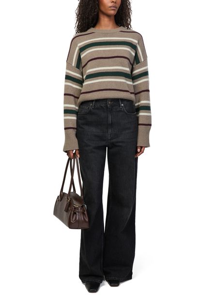 Reveal Skall Studio's crop round neck sweater, crafted in ribbed fabric with a striped print. The dropped sleeves and long-sleeved silhouette offer a relaxed yet refined look, making it a versatile choice for layering or pairing with high-waisted pieces for a modern statement.