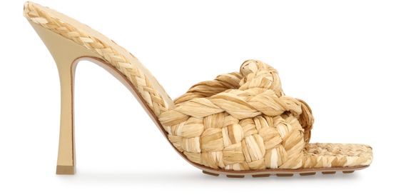 Bottega Veneta's sandals feature a distinctive design, with interwoven raffia and a twisted strap for a bold and elegant look. The elongated squared toe and open square toe add a modern touch, while the leather covered stiletto heel provides sophistication. Finished with a rubber-injected leather outsole for durability and comfort.