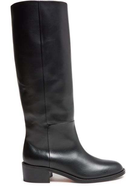 Unveil Aquazzura's Sellier 40 boots, crafted from smooth leather and featuring a stylish block heel. These boots boast a refined round toe with a closed design, complemented by a logo-printed insole and visible stitching. Perfect for those seeking elegance and comfort in every step.