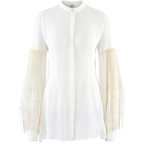 Discover Jonathan Anderson's latest Loewe collection inspired by ceramist William de Morgan. The Loewe puffed sleeved shirt offers a loose and elegant fit. Combined with pleated trousers and pumps, it is perfect for a bohemian-chic look.