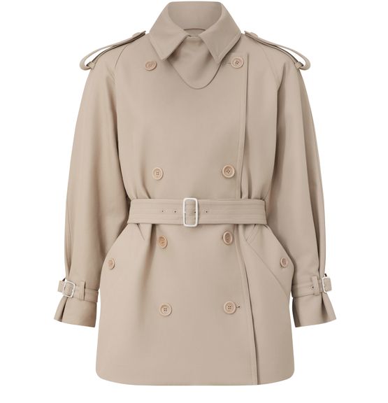 Reveal Max Mara's short oversize trench coat, a modern interpretation of timeless sophistication. The double-breasted silhouette features a structured collar, long sleeves, and practical patch pockets. Two front pockets add utility, while the crisp tailoring ensures versatile styling for both casual and refined occasions.
