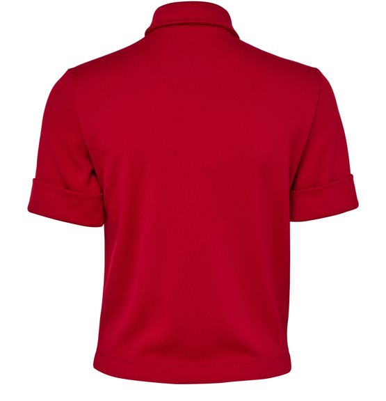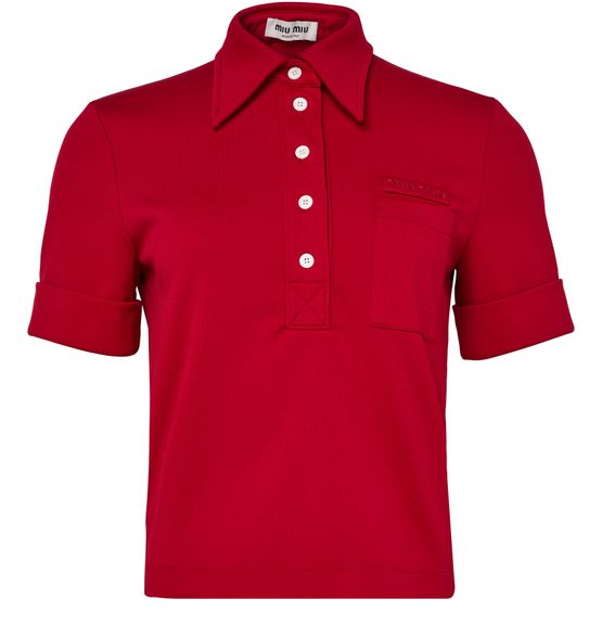 Reveal Miu Miu's short-sleeved polo shirt, featuring a refined front buttoned closure and a distinctive decorative label with the iconic logo. The tailored silhouette and practical breast pocket make this top a versatile choice, seamlessly blending sophistication with everyday ease.