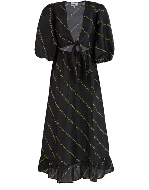 This silk midi dress embodies a reworked vintage look. Ganni is the name behind this flowing piece, with wide sleeves, floral print, and tie neckline.