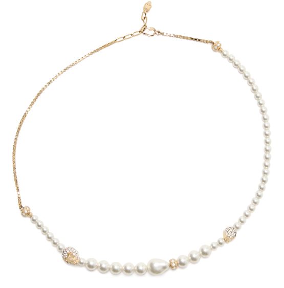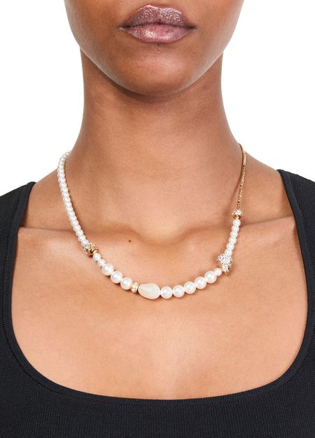 Introducing Alexander McQueen's Skull and pearl necklace, a masterpiece of elegance. Adorned with exquisite bead details and a luxurious gold finish, it ensures a sophisticated flair. The snap-hook closure offers both security and style, making it a must-have in your collection.