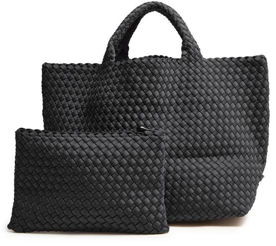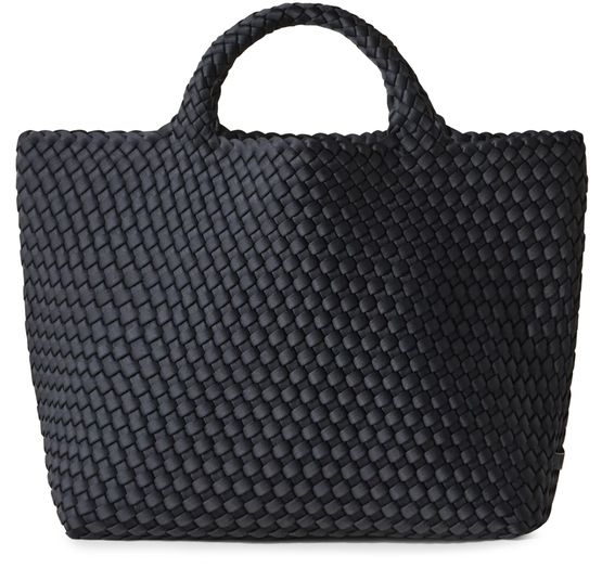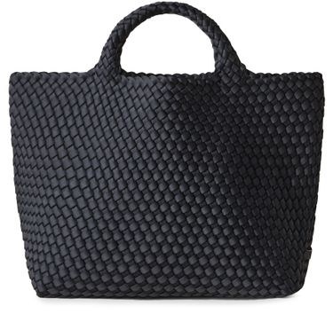 Reveal Naghedi's St Barths medium tote, crafted in open weave for a contemporary look. The double handles offer versatile carrying, while the spacious interior compartment ensures effortless organization. This tote blends modern design with practical elegance, making it a standout accessory for any occasion.