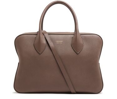Ferragamo's Stella handbag showcases a sophisticated design with a zipper closure and double handles for versatile styling. The front logo in gold letters adds a touch of elegance, complemented by visible topstitching. With an adjustable strap, it can be hand carried, worn crossbody, or elegantly slung over the shoulder.