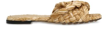 • Description : Open square toe, twist detail, twisted Intrecciato raffia strap, flat heel, rubber-injected leather sole.