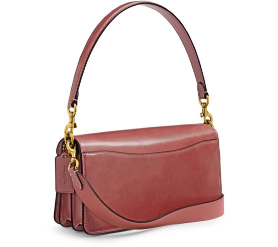 Reveal Coach's Tabby 26 shoulder bag, crafted from smooth leather with a magnetic "C" buckle and gold finish. The single handle and visible stitching highlight refined craftsmanship, while the front logo adds a signature touch. This piece seamlessly blends modern design with timeless sophistication.