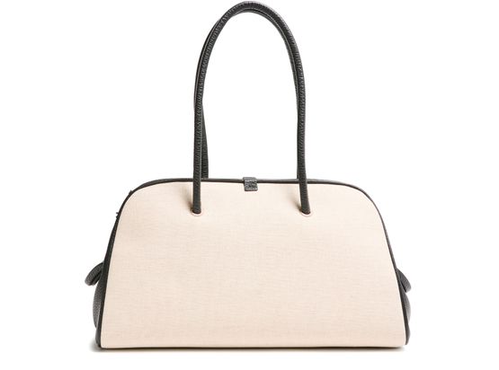 • Description : Shoulder bag, double handles, leather handle, front logo, bi-material, zipper closure, snap-button fastening, visible topstitching.