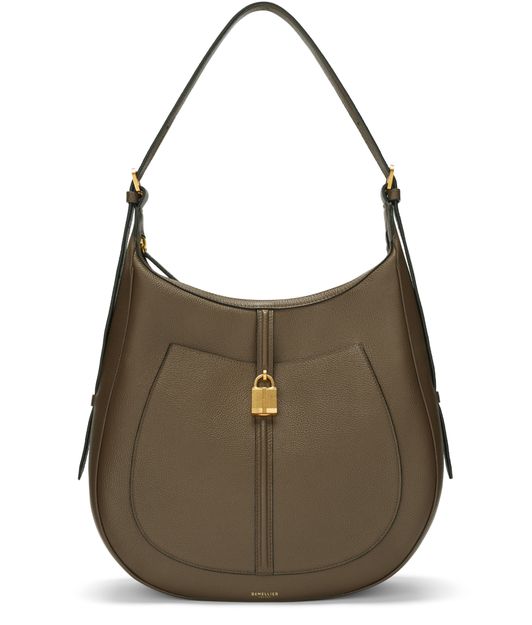 Reveal Demellier's The Vancouver hobo bag, crafted from grained leather with a sophisticated single handle. An adjustable strap and gold clasp add practicality and elegance, while the front logo gleams with a gold finish, exemplifying refined design.