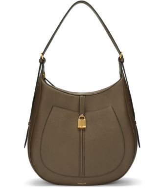 • Description : Hobo bag, shoulder bag, grained leather, single handle, adjustable strap, gold clasp, front logo, gold finish.