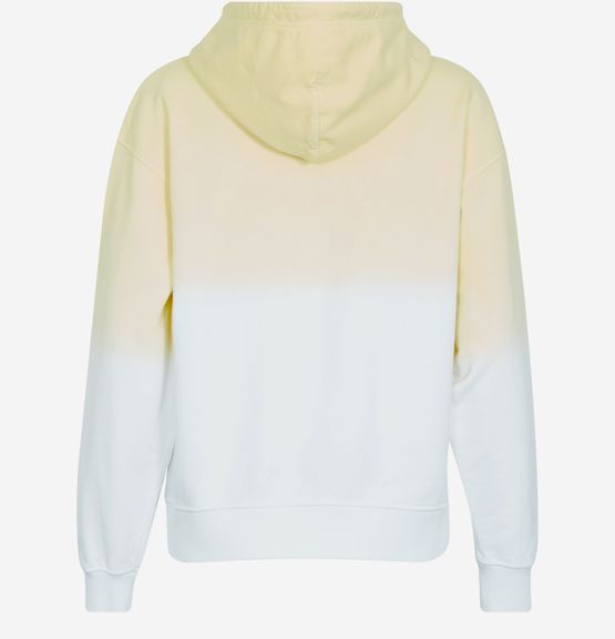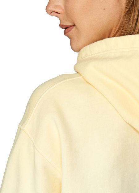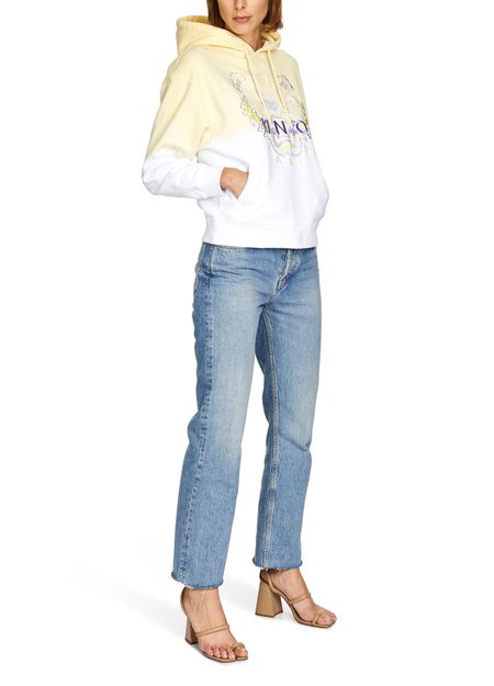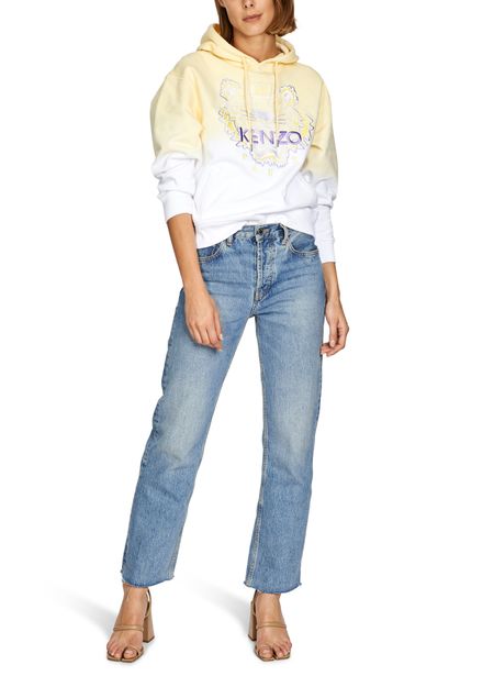 The Tiger print has become the signature of the Kenzo company. It comes in yellow and purple on this cotton hoodie, which you wear with a straight skirt and a pair of trainers.