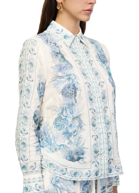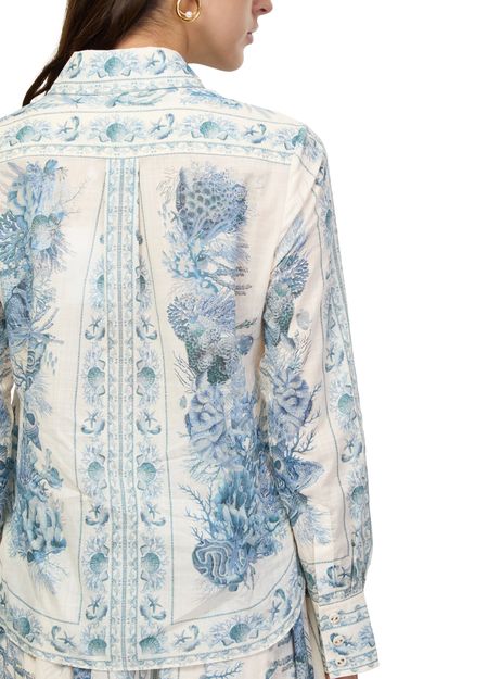 Reveal Zimmermann's floral print blouse, a statement top with long, cuffed sleeves and a refined silhouette. The delicate floral pattern and tailored cuffs add a touch of sophistication, making it perfect for pairing with tailored pants or skirts for both daytime and evening occasions.