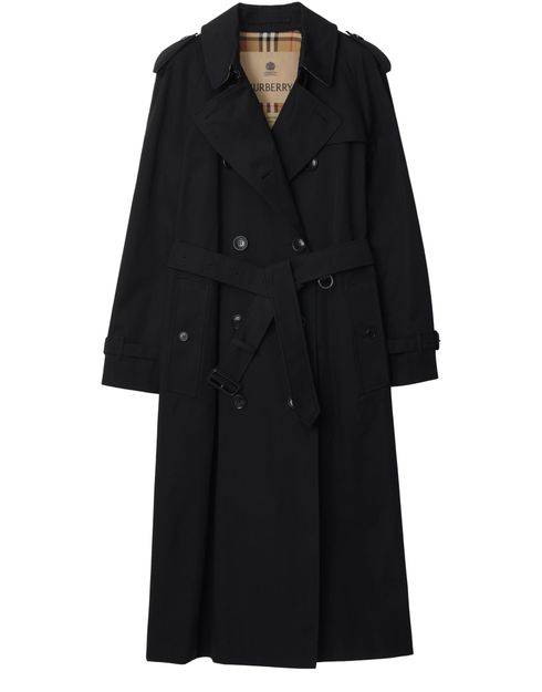 Reveal Burberry's long trench coat, a refined silhouette featuring a classic collar, double-breasted closure, and practical flap and side pockets. The long-sleeved design and tailored fit offer timeless appeal, making this piece a versatile choice for both sophisticated and everyday ensembles.